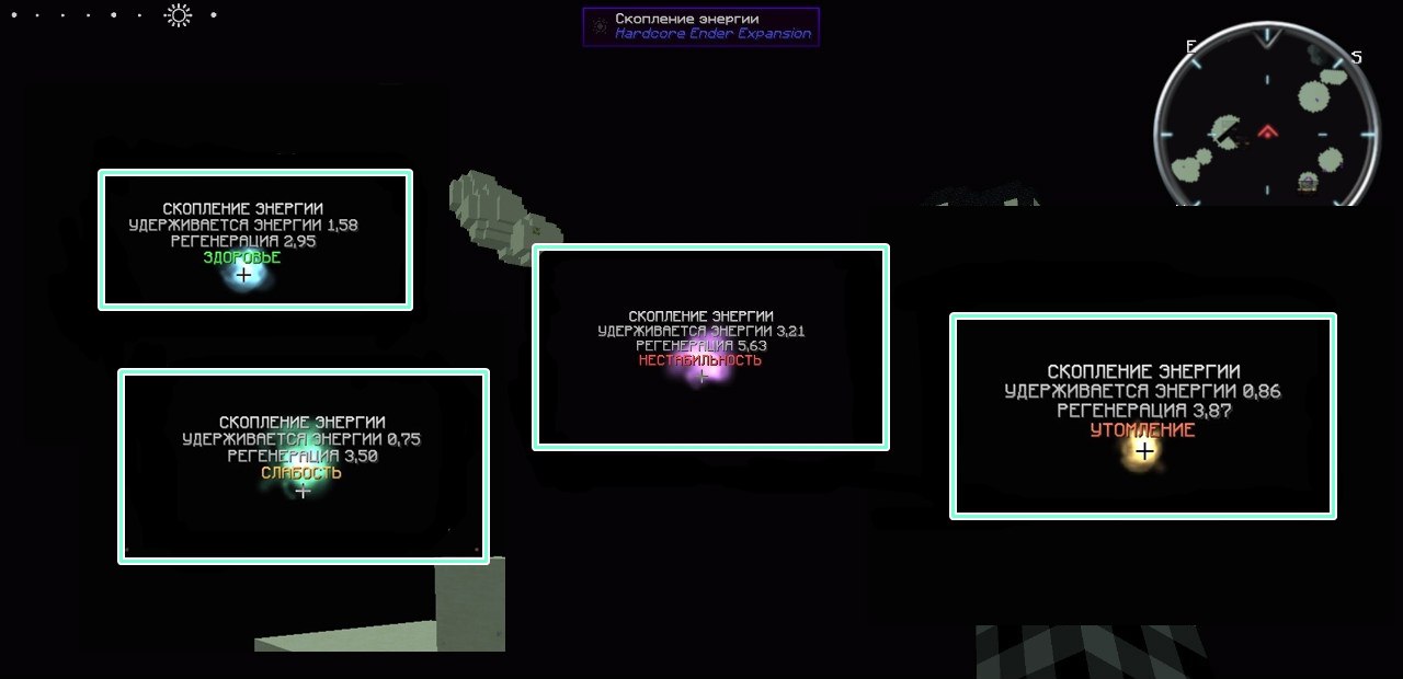 Так же, когда вы будете отлетать от основного острова края - вам начнут встречаться скопления энергии, чем дальше - тем чаще. Они понадобятся для зарядки блоков из данного мода. К ним тоже более подробно вернемся позже.