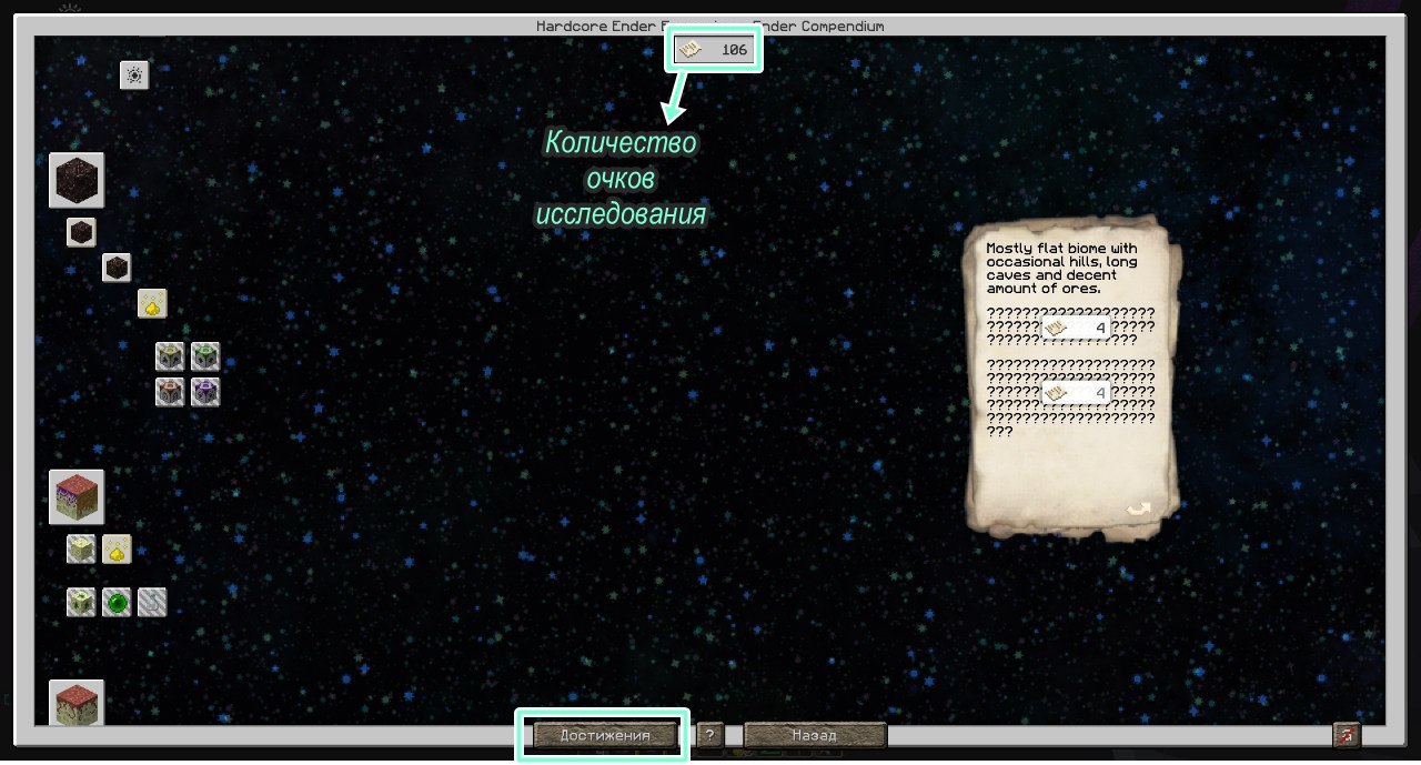 Чтобы начать изучать Hardcore Ender Expansion, нажимаем англ P. После чего вы увидите открывшийся Эндер компендиум (Ender Compendium) - вот что он из себя представляет: