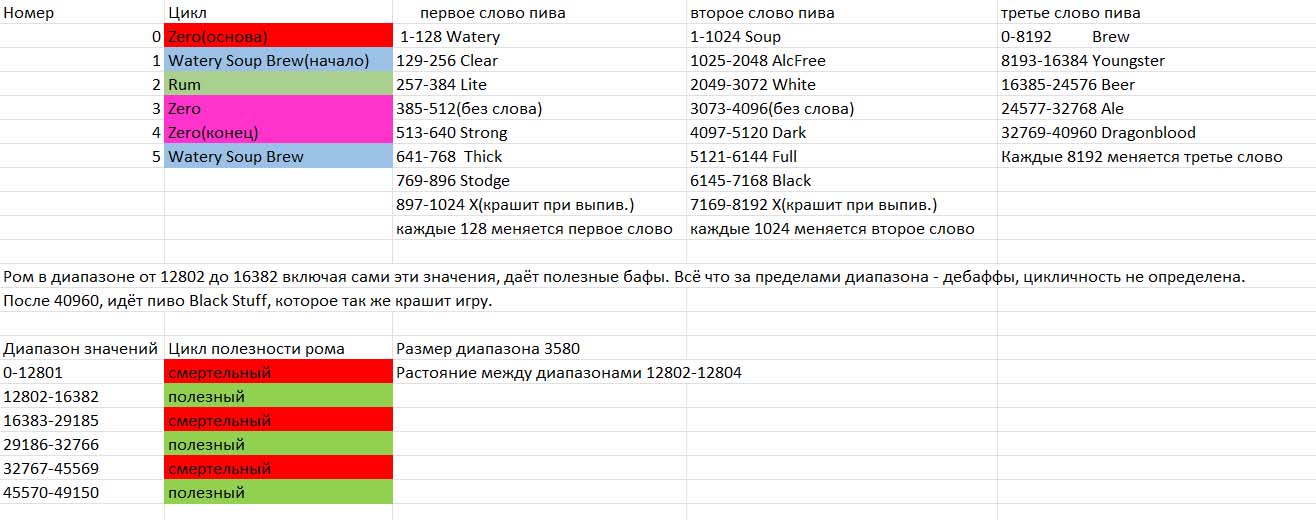 Очень важно учесть, что исходя из моих личных опытов на spacecross, можно сделать вывод, что DragonBlood вы никак не получите, ибо сервер просто не может сохранять метаданные у предмета больше, чем 32767. В одиночном мире его получить возможно, но после перезахода в мир, это пиво богов превратится в бурду, ибо сбросятся метаданные из-за превышения величины в 32767. Также при помощи этой таблицы, можно идентифицировать содержимое бочки, а также отличать плохой ром от качественного.